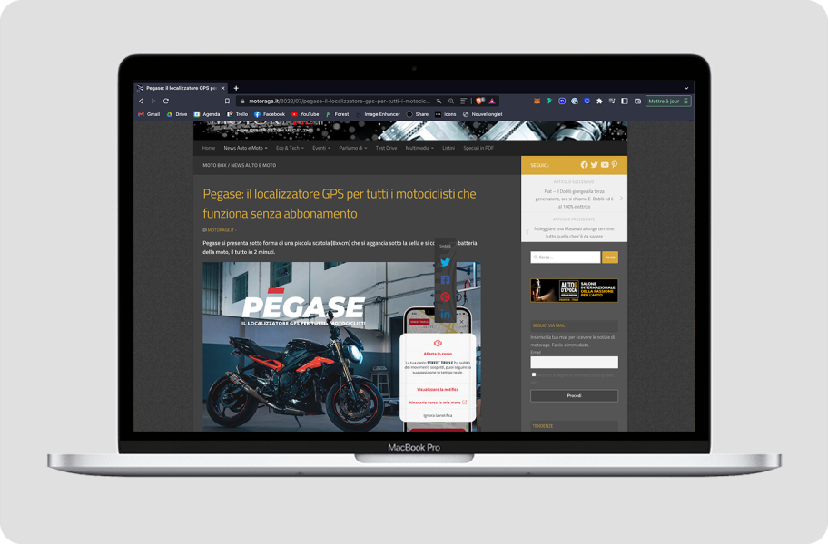Pegase Moto è progettato e prodotto in Francia, con certificazione ECE R10, garanzia di qualità. Grazie alla protezione contro la scarica, la batteria della tua moto resta sempre al sicuro. Pegase Moto è un mini GPS compatto, senza SIM e da installare in autonomia – funziona senza abbonamento.