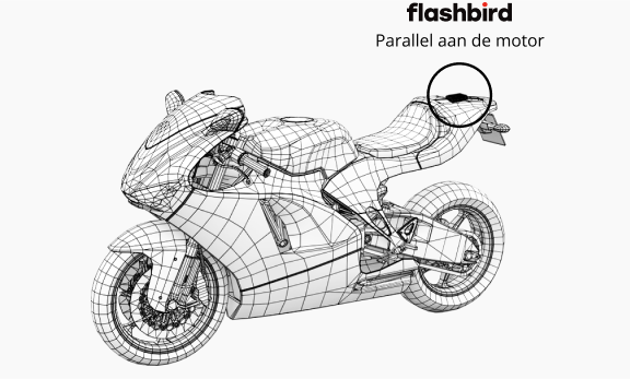 Uw accu bevindt zich meestal onder uw zadel. De stroomkabel van de Flashbird box eindigt met twee zwarte en rode "vorken" waarmee je hem op de accu kunt aansluiten zonder hem los te hoeven koppelen. Daartoe draait u gewoon de schroef op een van de accupolen iets los, schuift u de vork eronder en draait u hem weer vast. Ga als volgt te werk: sluit eerst de zwarte kabel aan op de negatieve (-) pool van uw accu en vervolgens de rode kabel op de positieve (+) pool van uw accu.